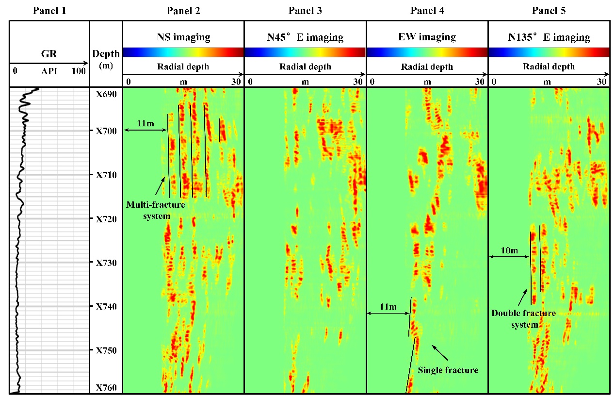 实际裂缝性发育地层中,入射SH横波可以通过裂缝沿伸方向上的闭合处在多个裂缝间不断产生反射并在井中被接收,这很好地解释了远探测成像中的多裂缝体系现象。