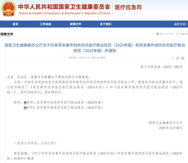 国家卫生健康委办公厅关于印发突发事件创伤伤员医疗救治规范(2025年版)和突发事件烧伤伤员医疗救治规范(2025年版)的通知